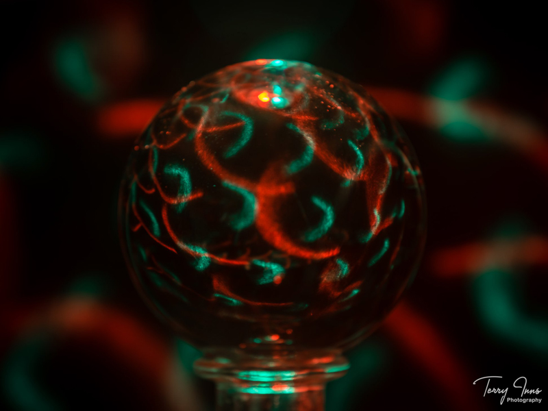 This project started out as my first attempt to capture light reflecting through my new Lensball. It was very simple to create, simply standing my Lensball on top of a bottle with a nice clear neck a few inches (6-10) away from a black backdrop cloth and using a small disco light to create some light effects. At 4.2 seconds at F5.0 and ISO 64, this image shows what not to do... See the reflection of my tripod! As you will see from my gallery, tweaking the exposure down to 1.7 seconds, I managed some much better results.