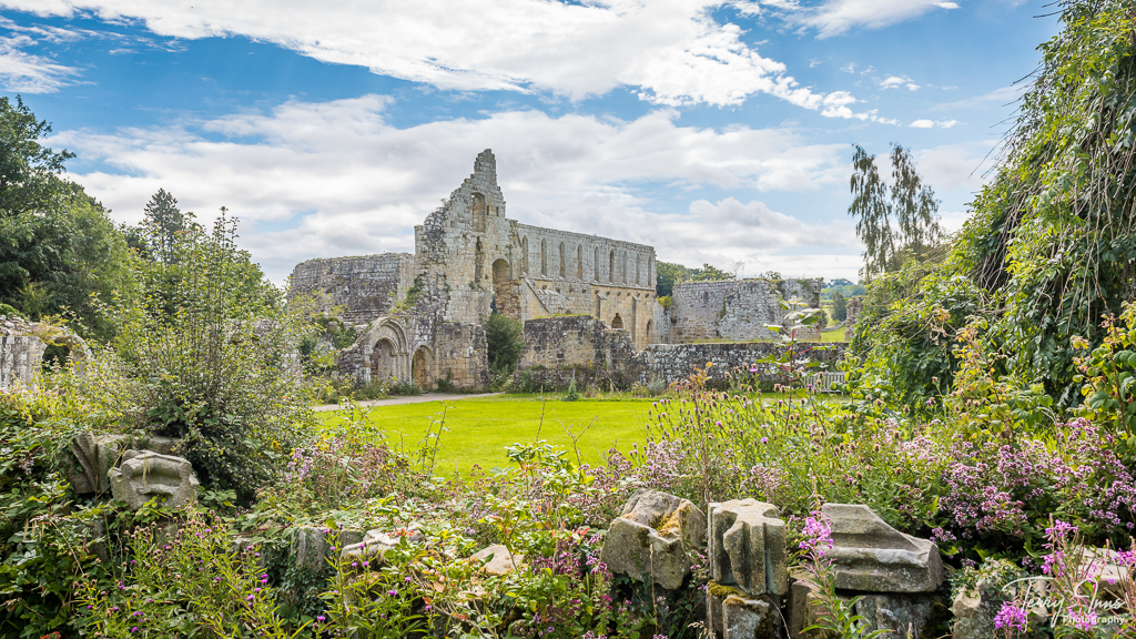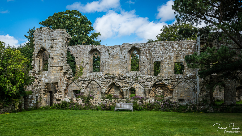 The abbey itself is an intricate maze of walls (or what is left of them) nestled in the Yorkshire countryside with its open spaces grassed over and surrounded by trees and wild (and some not so wild) flowers. From a distance the abbey blends into the scenery. This shot was taken from a distance across the field at 24mm (Using my 24-70mm lens) 1/500sec at F5 and ISO64.