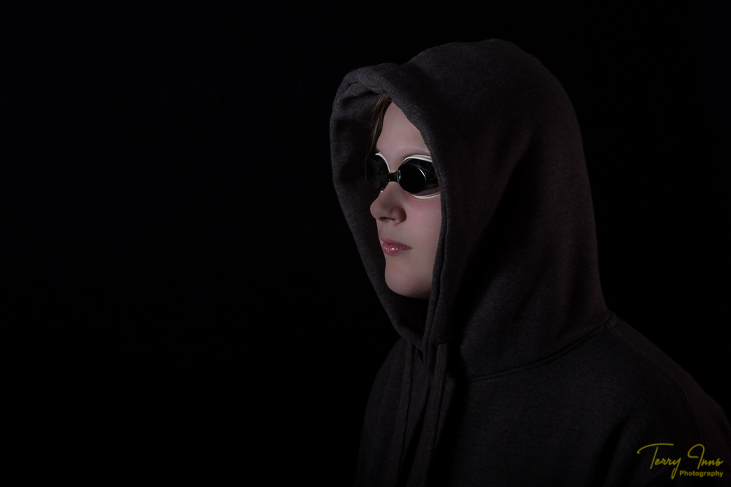 This next shot was part of the same photo shoot as the first in this project. My daughter is a competitive swimmer and wanted to capture a shot of her in her swimming hoodie and goggles. The close crop, expressionless pose with these accessories makes the shot speak of concentration, the athlete in the zone!